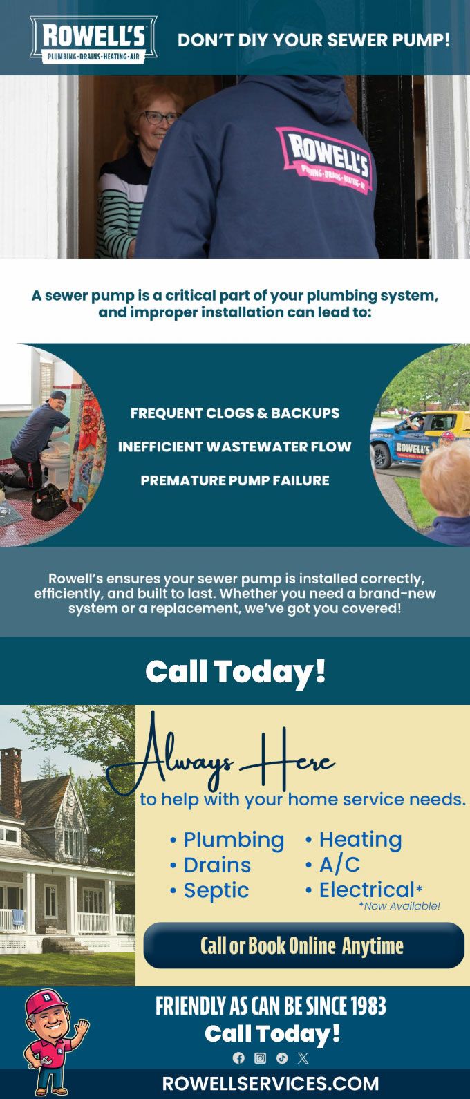 "Friendly As Can Be Since 1983!" When you need help with your plumbing, drains, heating, cooling or electrical in Hollis, you can always rely on Rowell's Services! Call us now or book online!